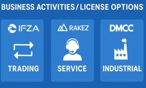 - Licence types: Commercial (trading goods), Service (consultancy/IT/marketing), Industrial (manufacturing/production) all three zones offer.